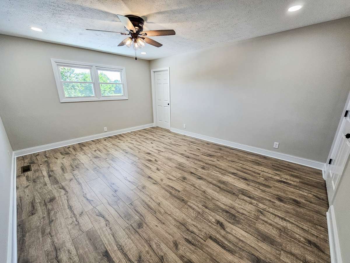 from the three additional bedrooms. The focal point of the living area is the stone fireplace, with gas logs. New LVP and tile flooring extend throughout the house. The kitchen features solid butcher block counter tops, an island, and new stainless appliances. The spacious primary ensuite was completely reconfigured and features a large tile shower with frameless glass door, a double vanity
