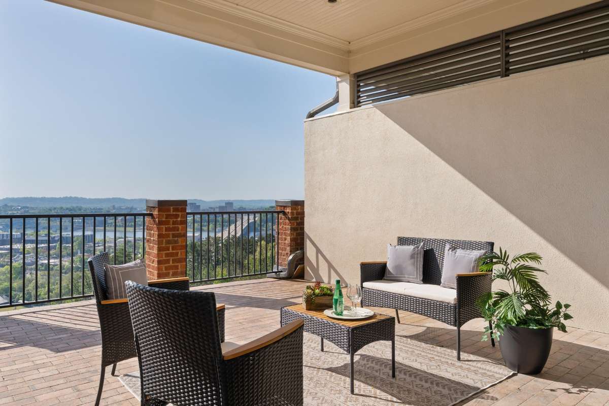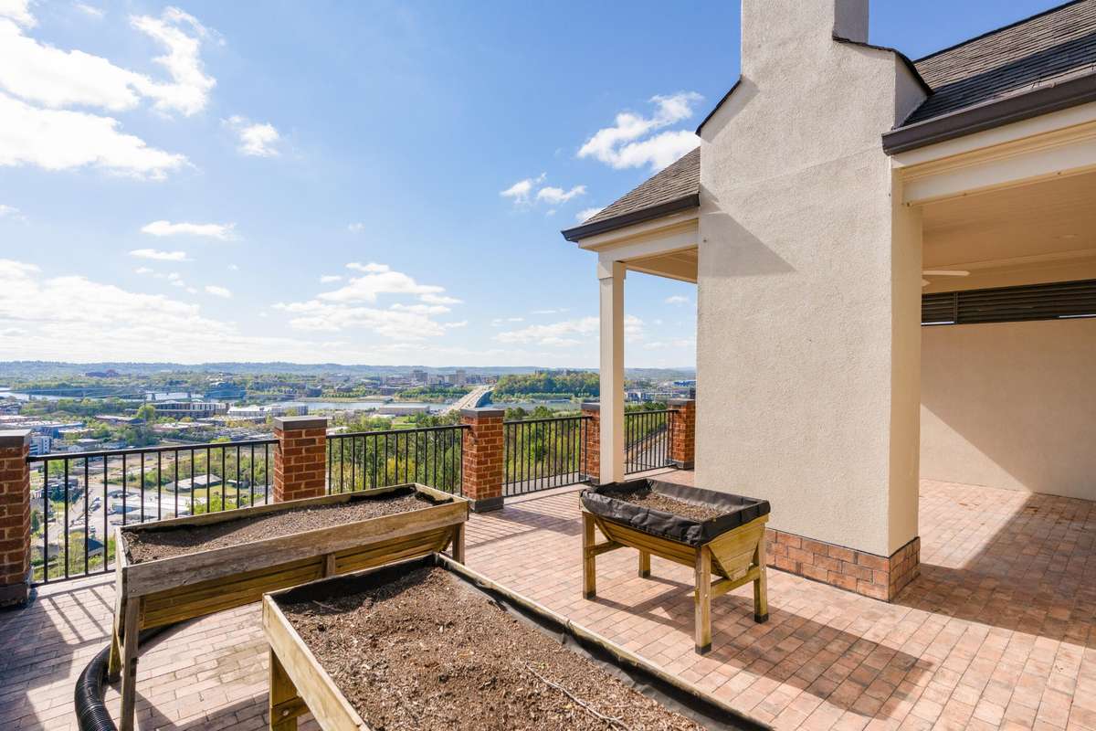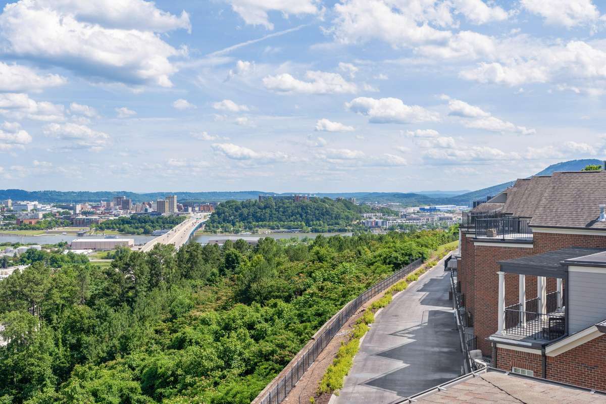 Location, City- Lights Views, Elevator & a 3- Car Garage! Amazing views of the bridges across the Tennessee River to downtown Chattanooga and the mountains beyond from this spacious 3 bedroom, 3. 5 bath condo at the desirable River Point development on Stringer' s Ridge just minutes from the shopping and restaurants of the North Shore, schools, parks, hospitals, and downtown Chattanooga. This beautiful condo boasts hardwoods in the living areas, new carpet in the bedrooms, crown molding throughout most of the unit, an open floor plan, primary suite on the main, an elevator, fantastic outdoor living spaces and both a double and single bay garage. Your tour of the unit begins with entry from the second- floor common landing to the dedicated foyer with the powder room and elevator on the left and the main hallway and staircase on the right. This main hallway leads to the primary suite, a large laundry room and the wonderfully open kitchen, breakfast, living and dining rooms. The kitchen has a large center island, tile backsplash, under- cabinet lighting, stainless GE Monogram appliances, including the 6- burner gas cooktop, convection wall oven, microwave and built- in refrigerator, soft close cabinetry, and a stainless farm sink. The breakfast area has a decorative chandelier and sliding glass doors to the covered balcony where you can enjoy a meal while taking in the panoramic views. This view is replicated in the hand painted mural in the formal dining room which is also visible from the great room. The great room has a gas fireplace and built- in cabinetry and rounds out the open living concept. The primary bedroom has a large walk- in closet with organizer system and a full bath with a dual granite vanity, a walk- in jetted tub, a separate shower with tile surround, and a private water closet. Head upstairs where you will find an office with built- in workspace, a bedroom with a private bath and access to the balcony, a 3rd bedroom, a full hall bath, and a great bonus or fami