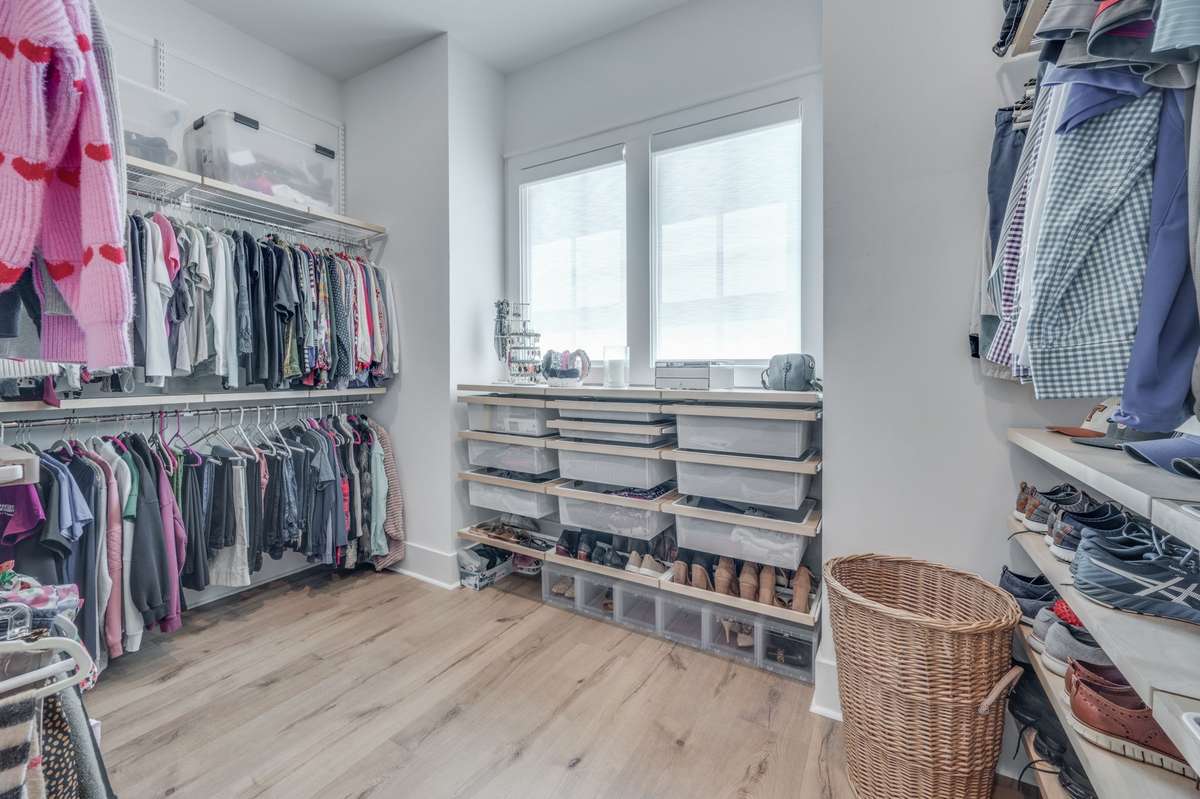 A welcoming foyer and custom drop zone anchor the entry and kitchen areas, offering both style and function. Upstairs, a spacious bonus room provides flexible living space, while two bedrooms share a Jack & Jill bath. A third upstairs bedroom and full bath are ideal for guests. The primary suite is a true retreat, featuring a fully built- out Elfa closet system for maximum storage and organization. Designer light fixtures elevate every room, adding just the right finishing touch.