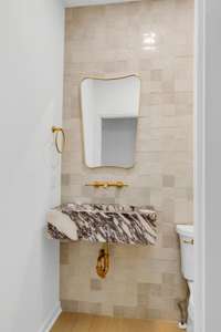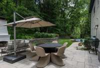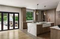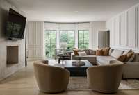 The chef’s kitchen is a showstopper, featuring marble countertops, a La Cornue range, and a spacious butler’s pantry. The newly redesigned primary suite offers a spa- like bath with heated floors for year- round comfort.