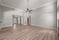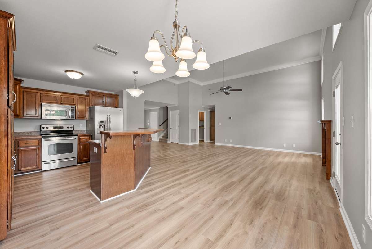 The open floor plan seamlessly connects the kitchen, dining, and living areas, creating a spacious and inviting atmosphere. Large windows fill the space with an abundance of natural light, making it feel warm and airy throughout the day.