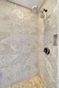 A spa-inspired retreat featuring gleaming porcelain floors and walls that exude timeless sophistication.