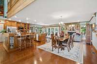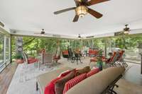 The kitchen is a chef’s dream with granite countertops, a gas range, and access to a screened- in porch designed for year- round enjoyment—complete with luxury vinyl plank flooring, a full bar ( ice maker and fridge included) , and a rain- protecting canopy.