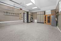 Outside, a screened/ glassed covered patio is ideal for year- round relaxation and gatherings. The two- car garage features built- in lockers, a dog washing station, and a sauna. The primary bedroom is downstairs with large walk- in closets and heated bathroom floors.