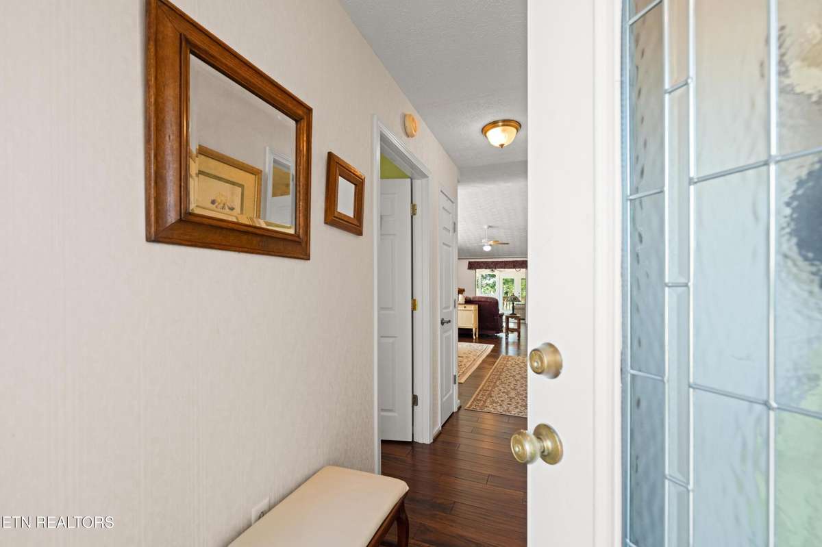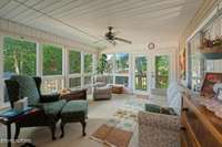 At the end, is a bright sunroom bathed in natural light offering a cozy retreat for relaxation or enjoying a morning cup of ' joe' . Large windows provide pictures of nature enhancing the home' s connection with nature.