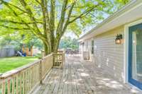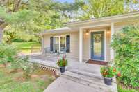 The home includes a full hallway bathroom with a double vanity and beautifully tiled shower/ tub combo. The primary suite offers a private en- suite bath for added comfort. Additional features include a laundry room, built- in desk/ workspace area, off- street parking, a durable metal roof, and both a welcoming front porch and a peaceful back deck for enjoying the outdoors.