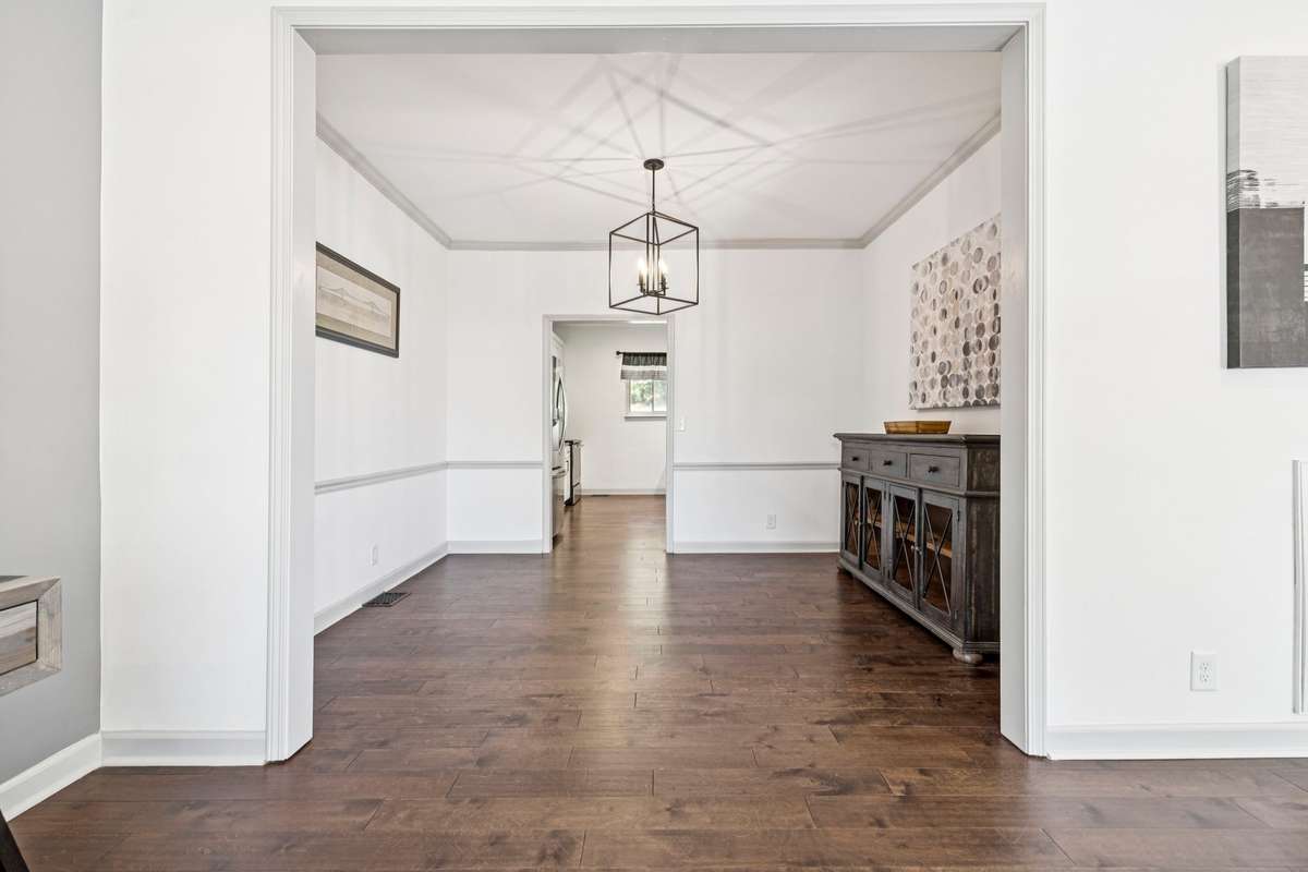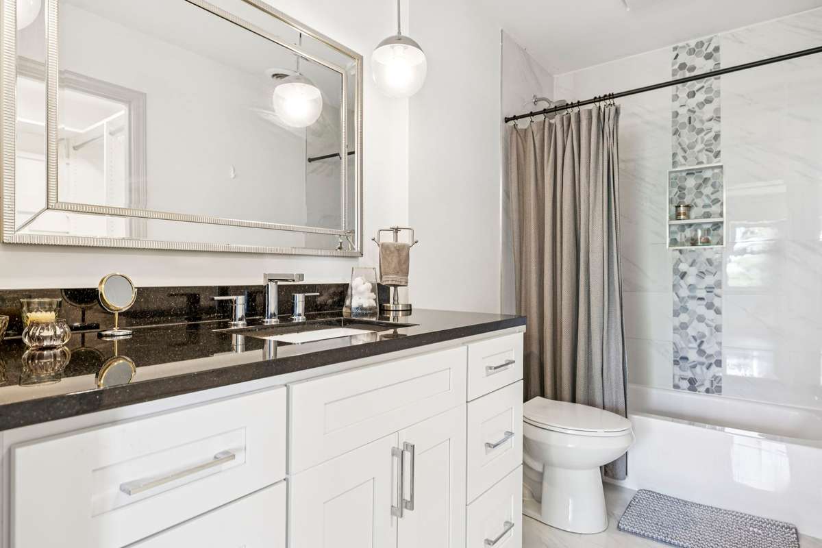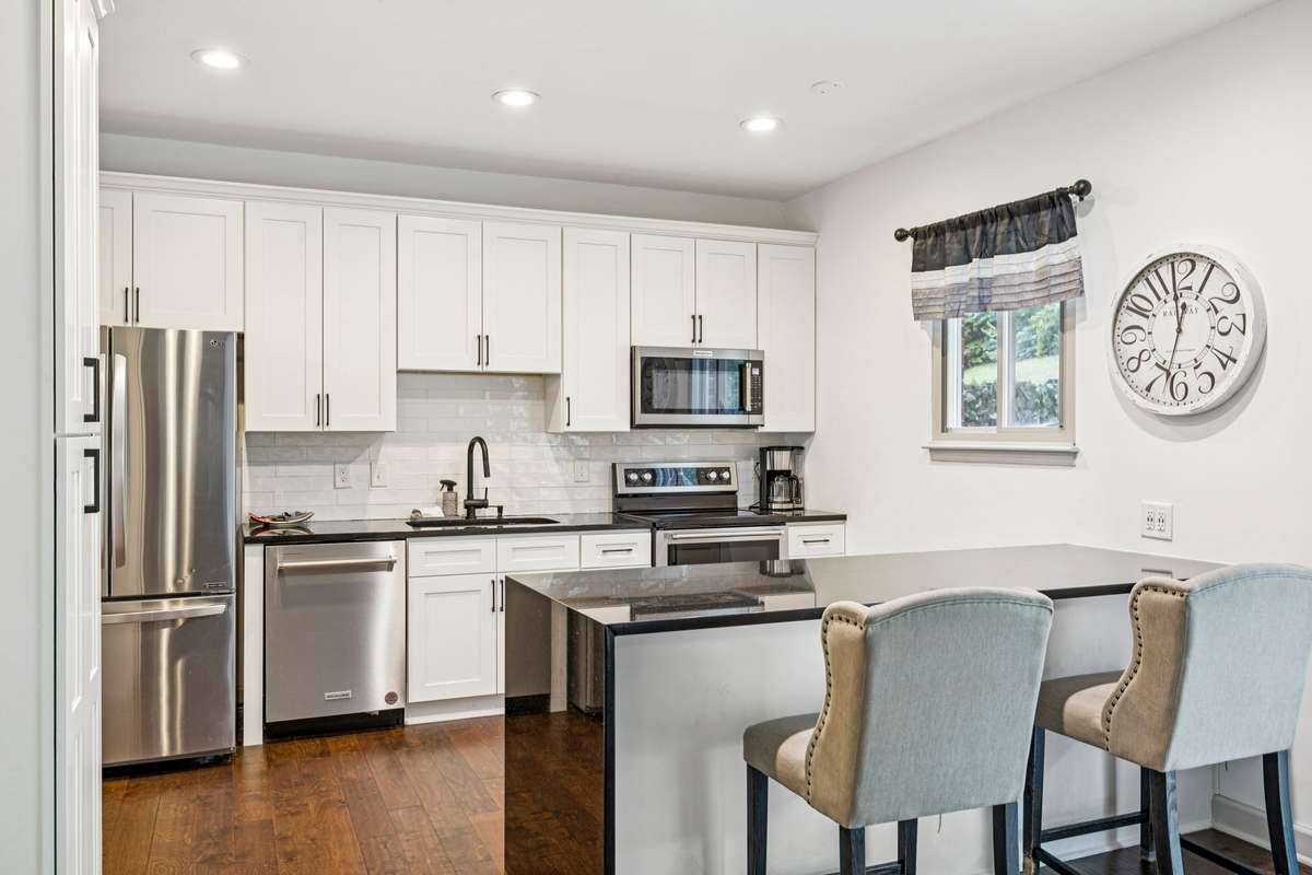 The chef’s kitchen features striking Black Galaxy granite countertops, crisp white cabinetry, and a glazed tile backsplash, complemented by new KitchenAid stainless steel appliances that elevate both function and design.