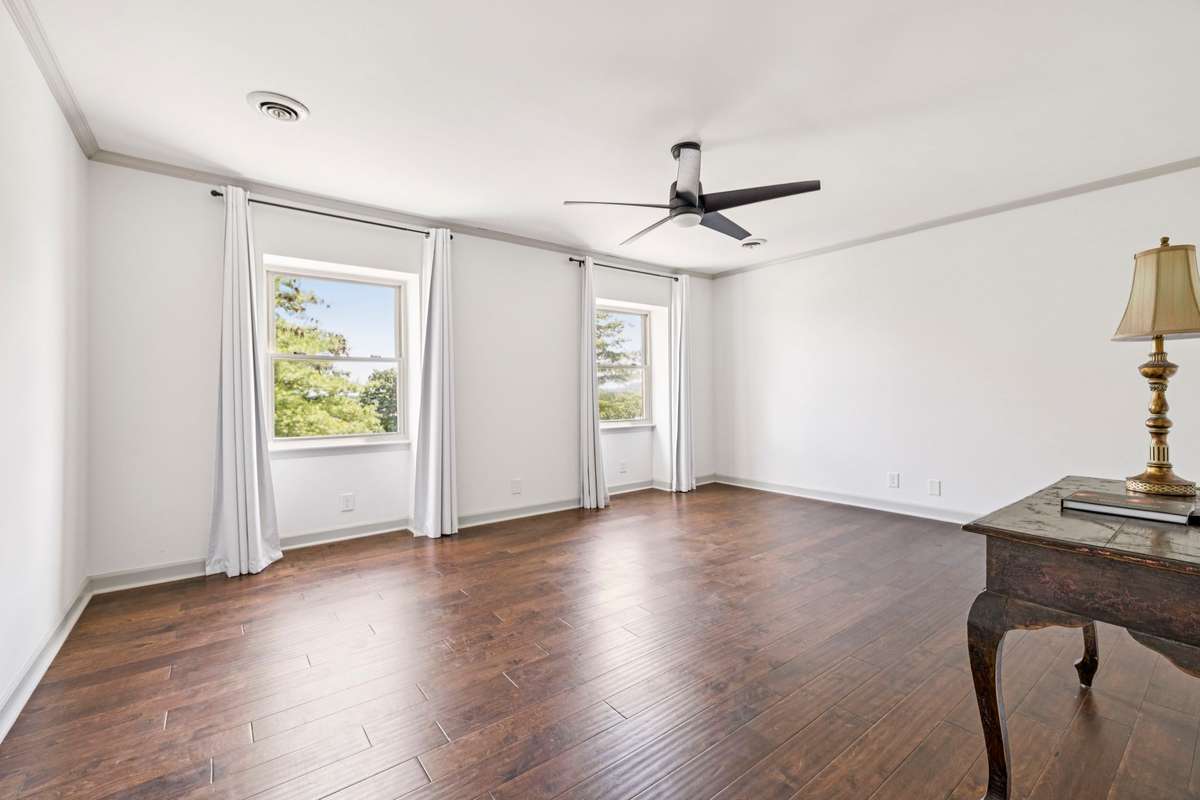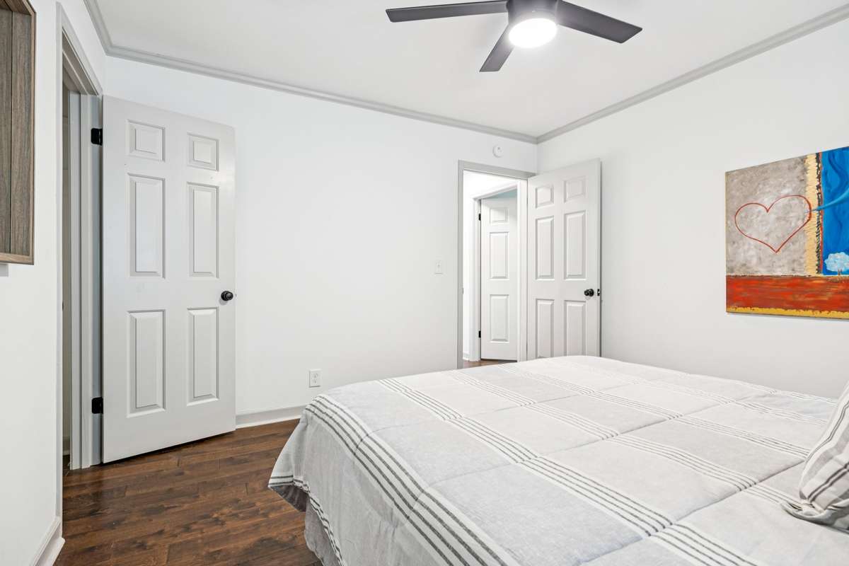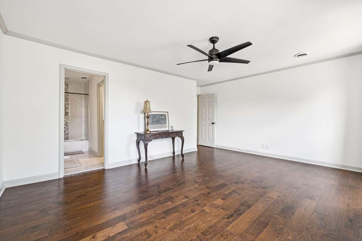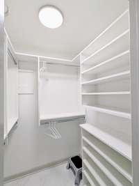 Upstairs, the primary suite offers a serene skyline view, an elegant en- suite bath, and a custom California Closet walk- in. Spacious secondary bedrooms each feature their own custom closet systems, while both full baths are beautifully tiled and thoughtfully appointed.
