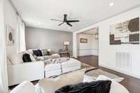 Additional highlights include a private two- car garage, a charming private patio for outdoor relaxation with private green space and abundant storage throughout. Recessed lighting, modern fixtures, and ceiling fans contribute to the home’s bright, comfortable atmosphere.