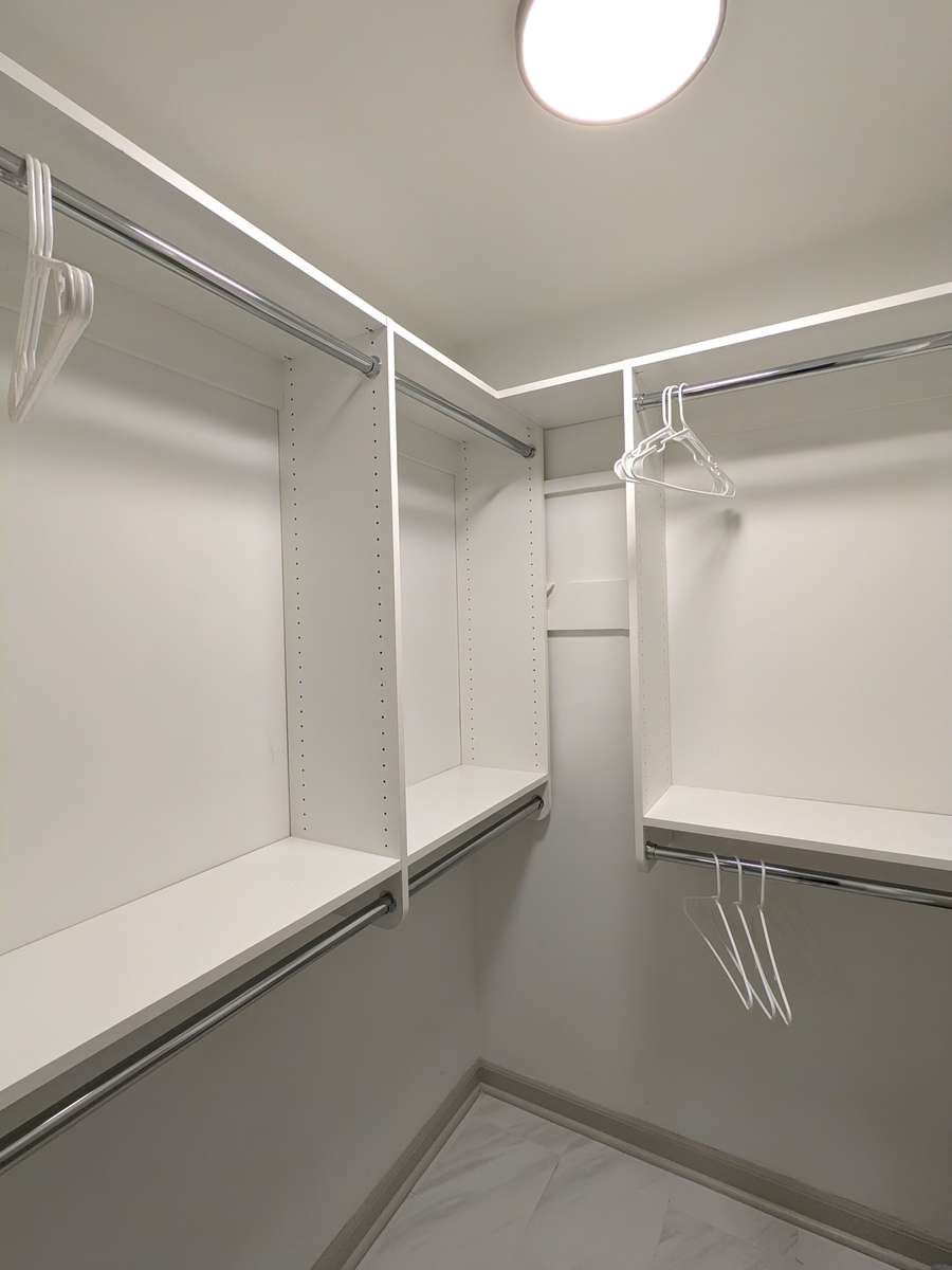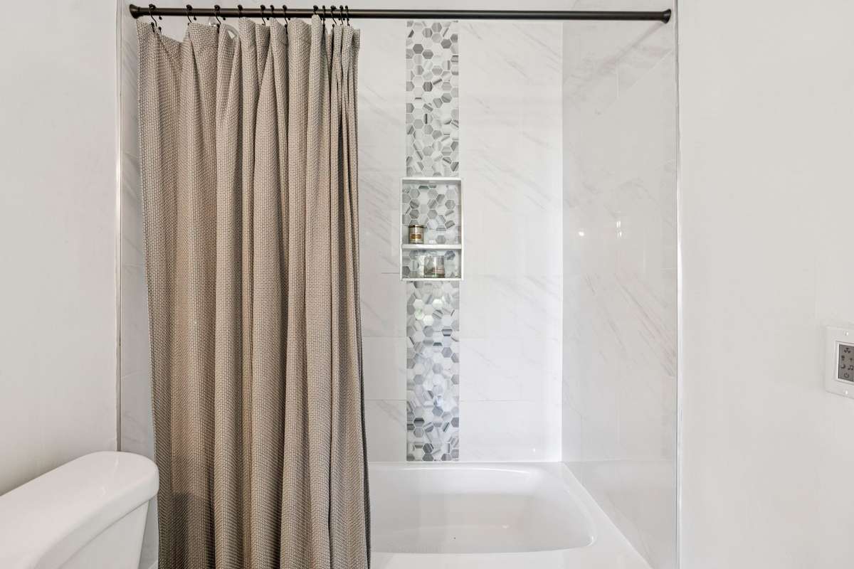 Upstairs, the primary suite offers a serene skyline view, an elegant en- suite bath, and a custom California Closet walk- in. Spacious secondary bedrooms each feature their own custom closet systems, while both full baths are beautifully tiled and thoughtfully appointed.