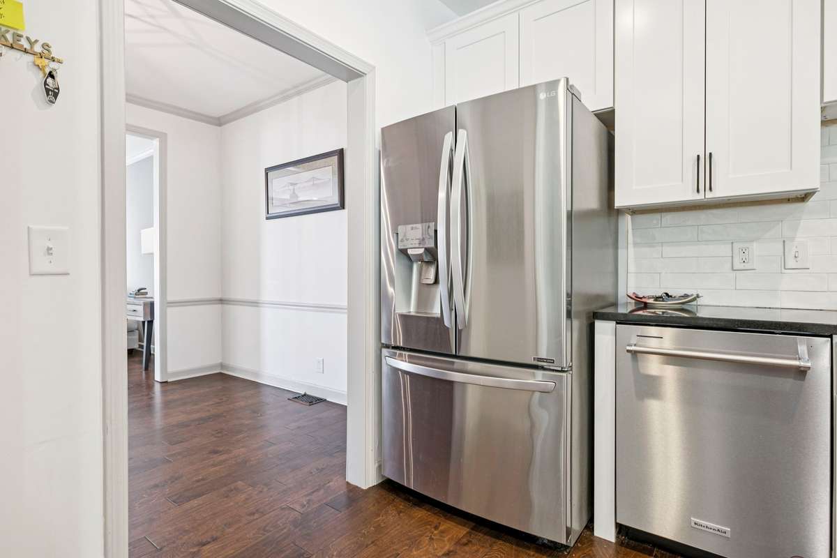 The chef’s kitchen features striking Black Galaxy granite countertops, crisp white cabinetry, and a glazed tile backsplash, complemented by new KitchenAid stainless steel appliances that elevate both function and design.