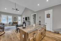 The chef' s kitchen is a true showpiece, boasting custom cabinetry to the ceiling with soft- close, dovetail drawers and doors, an oversized leathered granite island, WiFi- capable stainless steel appliances, a built- in microwave, LED under- cabinet lighting, a custom tile backsplash to the ceiling, and an upgraded kitchen sink with garbage disposal. The large walk- in pantry provides ample storage.