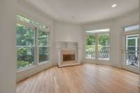 The kitchen offers newly painted cabinetry, stainless steel appliances, Thermador cooktop, trash compactor, double ovens, new designer lighting, and a fireplace that opens to the warm, inviting family room. The main- level primary suite includes a fireplace, spacious walk- in closet, dual vanities, soaking tub, and direct access to the main living area.