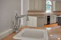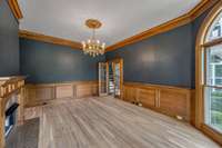 A dramatic two- story foyer painted in designer- favorite Iron Ore sets the tone, highlighted by a stunning chandelier. The main level features a soaring two- story living room with gas fireplace, formal dining room, rich wood- paneled library with its own fireplace, and a chic wine bar off the chef’s kitchen.