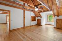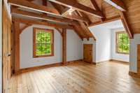 The two over- sized bedrooms upstairs have exposed beams, hardwood floors, custom solid wood doors, generous closets and dormer storage areas, and locally controlled heating and cooling split systems, ensuring privacy for guests or home- based office and with views of the lake and woods. A custom solid wood, open staircase leads from the main level to the second- level landing. The large bath has a shower, and ample granite- topped hardwood storage cabinets.