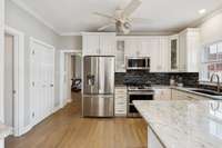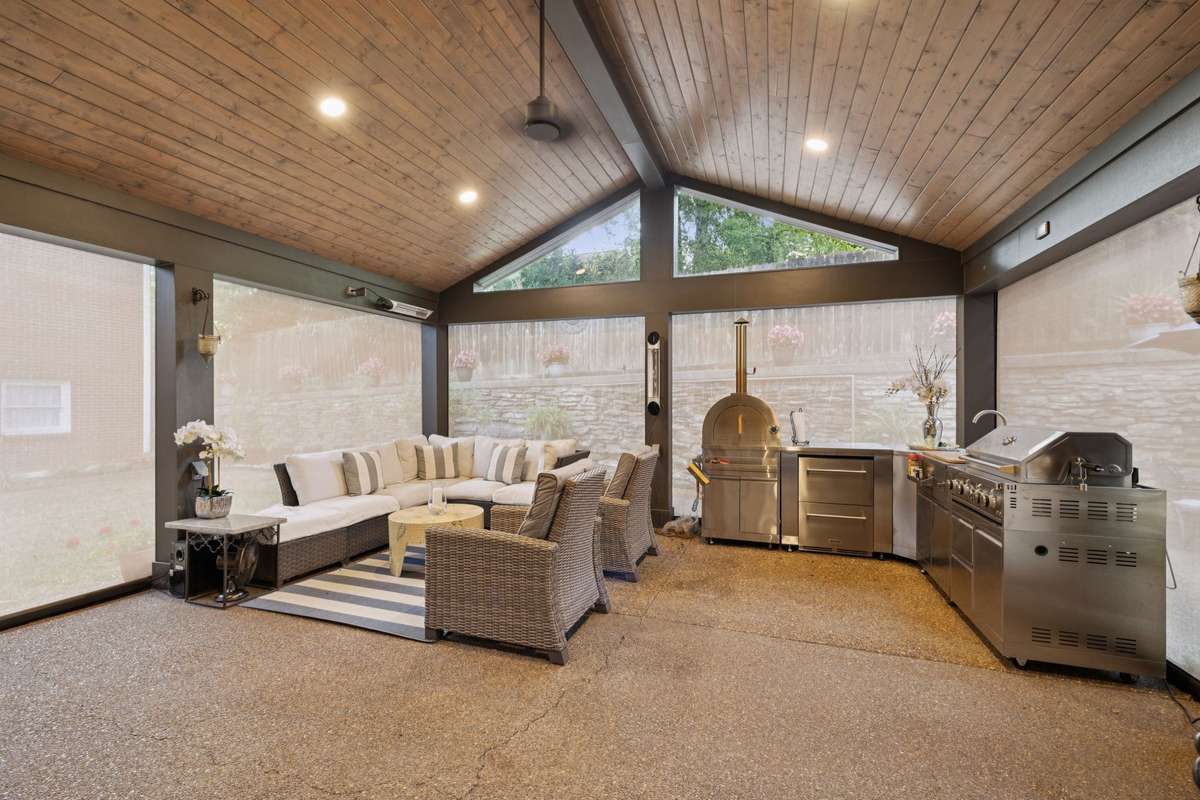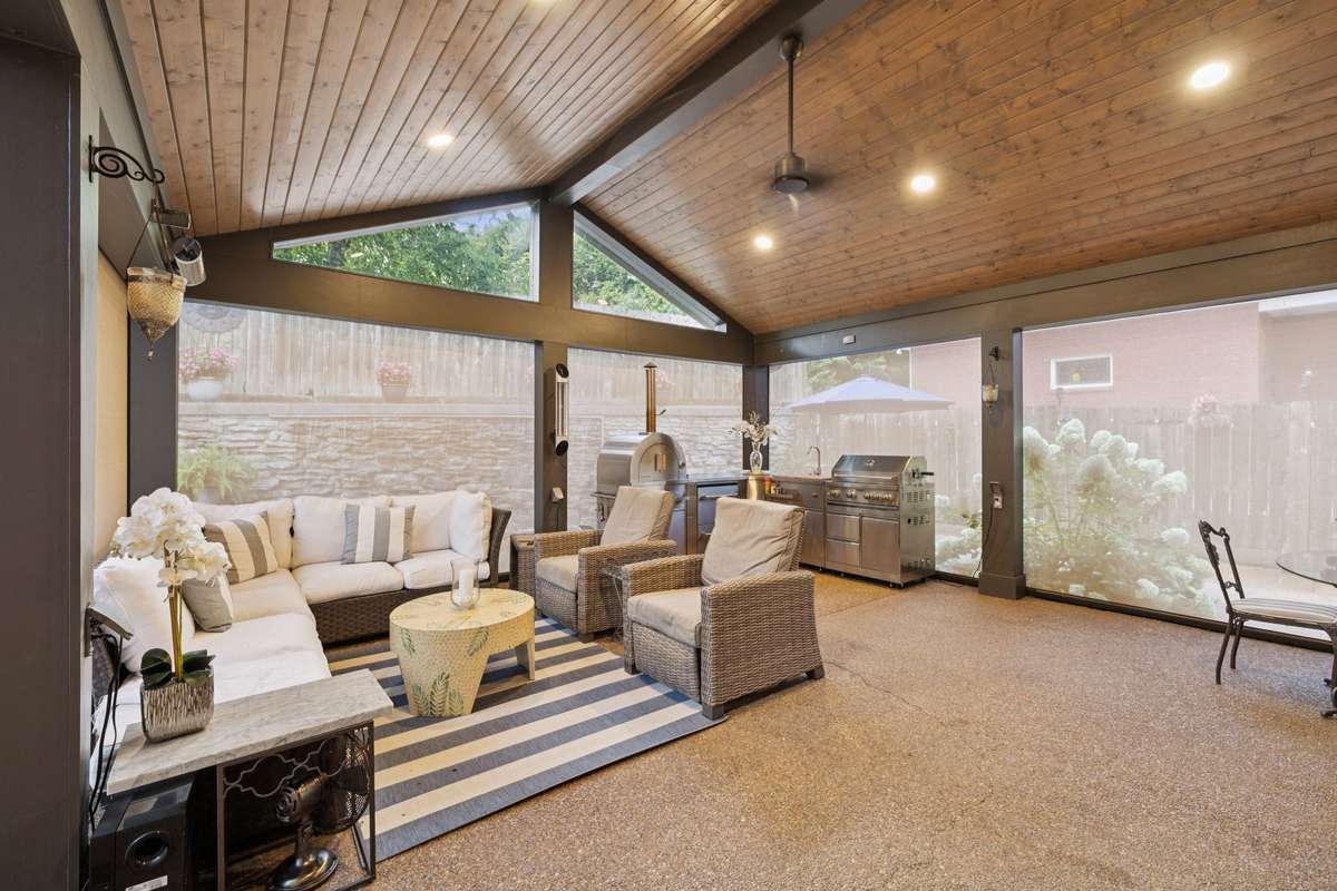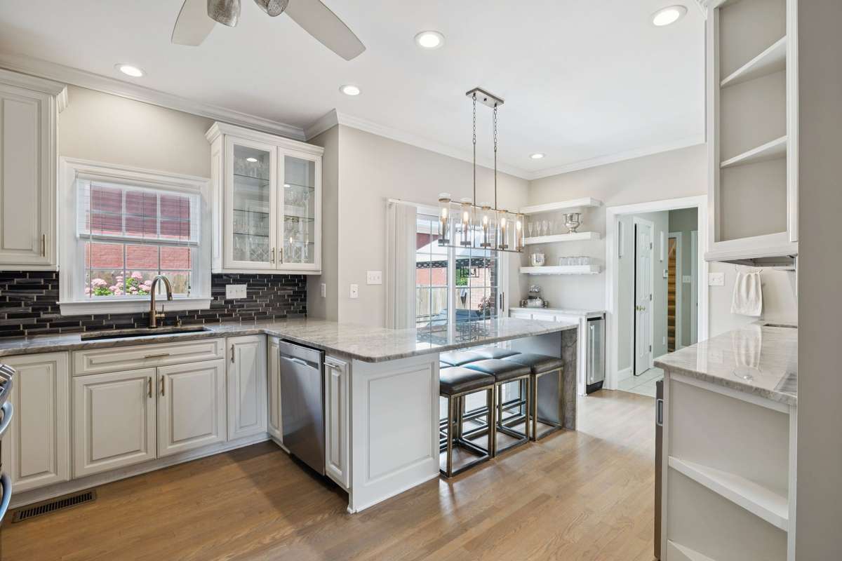 Two sets of sliding glass doors connect the dining room and kitchen directly to the European- style patio and landscaped backyard, creating an effortless indoor- outdoor lifestyle. Inside, recent updates include fresh paint, new lighting, and refinished main- level floors. The updated kitchen was designed with entertaining in mind, featuring a stunning waterfall island, plus a newly enhanced wet bar with built- in wine storage, a wine cooler, and an ice maker.