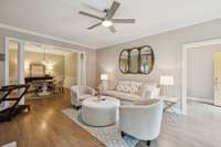 Ready to simplify? Downsizing never looked so good! Gorgeous garden home in the heart of historic Downtown Columbia, offering over 1, 000 sq. ft. of outdoor living space. The showstopper is the 440 sq. ft. covered porch, complete with motorized shades that preserve your view while providing privacy from the outside. A pitched ceiling, electric fireplace, and space heaters make this the perfect spot to cheer on your favorite team this fall. When the weather’s right, open the shades and flow seamlessly onto the 600 sq. ft. open- air patio, designed with multiple seating areas for dining, lounging, and grilling.