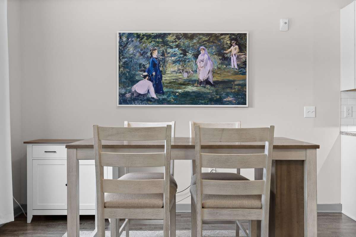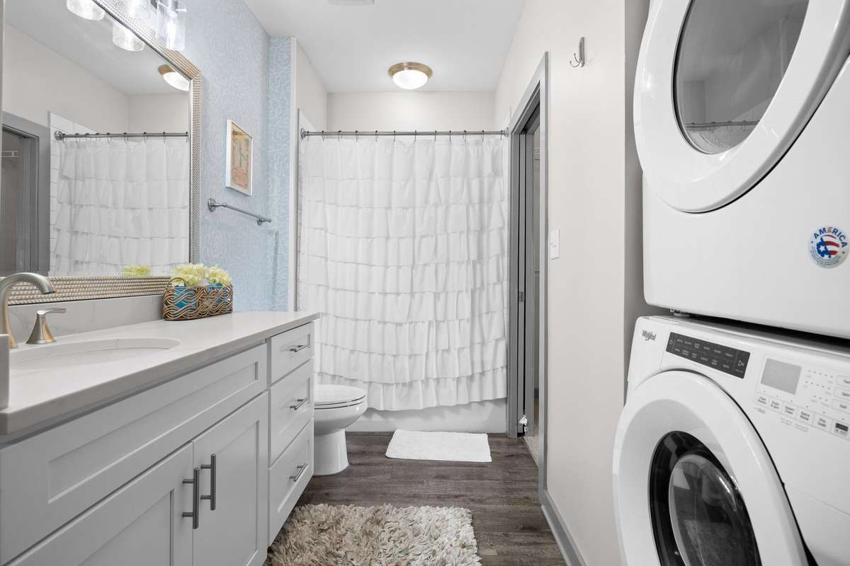 Inside, you' ll find a light- filled, open- concept layout with warm wood floors, a modern color palette, and a thoughtfully designed kitchen featuring stainless steel appliances, subway tile backsplash, a center island with seating, and generous dining space. The spacious bedroom includes a walk- in closet with built- ins and a stackable washer/ dryer, while the bathroom offers clean finishes and ample storage.