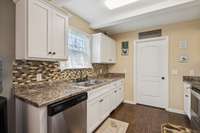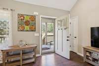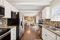 Inside, the home boasts an open- concept design with vaulted ceilings, creating a bright and airy feel. The living room and dining room flow seamlessly, leading into a galley kitchen equipped with all stainless steel appliances ( stove, refrigerator, microwave, dishwasher) that will remain with the home. Laminate flooring extends throughout the main living areas.