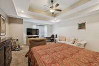 The master bedroom features a private master bath with a double vanity, a separate " water room, " and his and hers closets. The shower has ceramic tile, and the bathroom floors are vinyl tile. All bedrooms are carpeted and have ceiling fans, and the house is equipped with smoke detectors.
