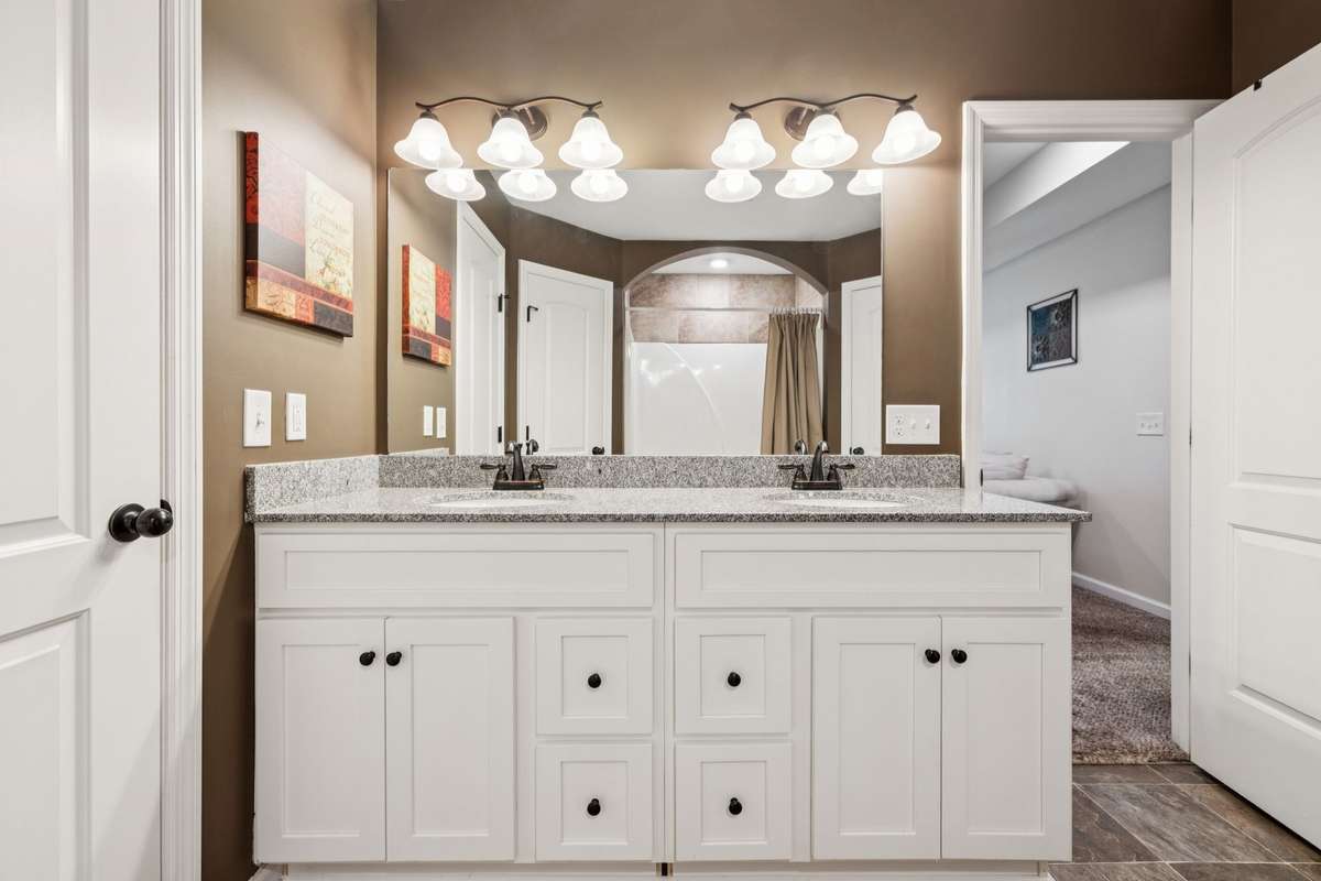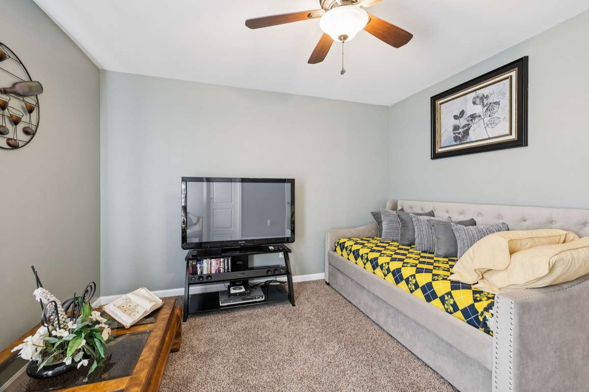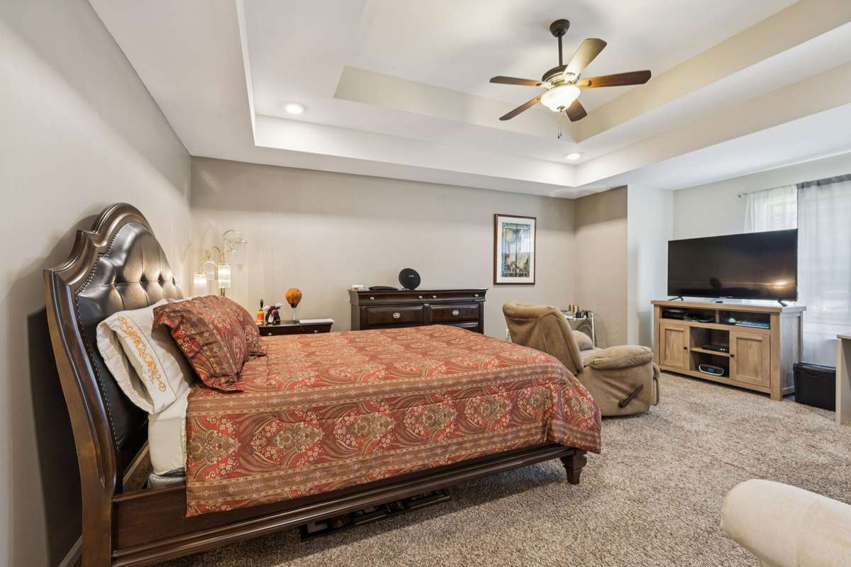 The master bedroom features a private master bath with a double vanity, a separate " water room, " and his and hers closets. The shower has ceramic tile, and the bathroom floors are vinyl tile. All bedrooms are carpeted and have ceiling fans, and the house is equipped with smoke detectors.