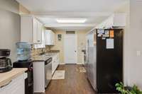 Inside, the home boasts an open- concept design with vaulted ceilings, creating a bright and airy feel. The living room and dining room flow seamlessly, leading into a galley kitchen equipped with all stainless steel appliances ( stove, refrigerator, microwave, dishwasher) that will remain with the home. Laminate flooring extends throughout the main living areas.