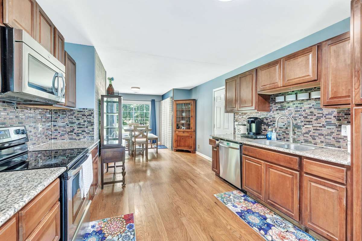 Beautiful kitchen with granite and tile backsplash.