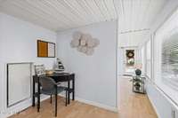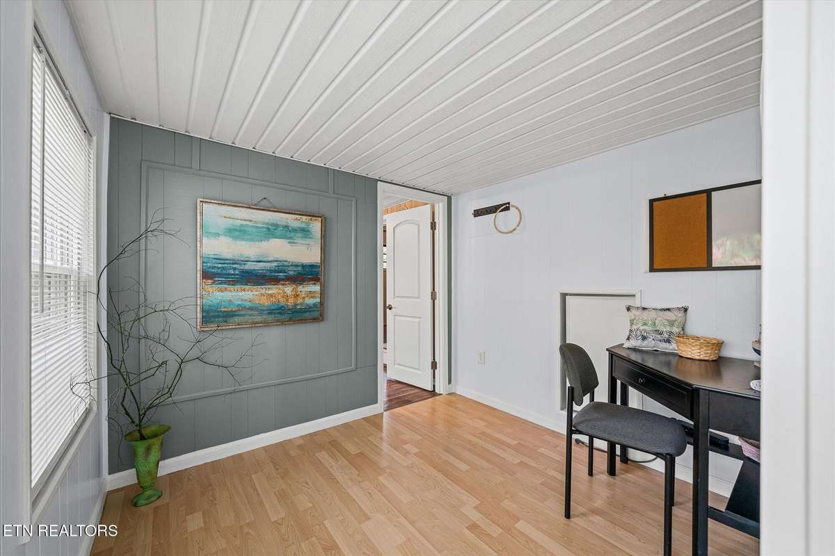 127968; A wall of windows spanning one side of the house brings in lots of natural light to the living room and office/ flex space. The kitchen boasts a breakfast bar and tons of cabinets, electric fireplace for auxiliary heat and ambience, and attached dining area with bay window. Two bedrooms, hall bath with new tub insert and flooring, and large hall closet round out the interior.
