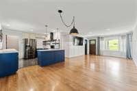 The daylight basement includes a laundry area, an open space ready for your design ideas, and a large hobby room. Off the hobby room is a one- of- a- kind fallout shelter with fold- down beds, making a great storm- safe space or creative kids’ hideout.