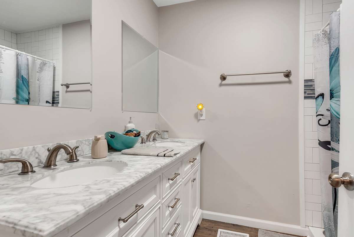 The spacious primary suite includes a private en- suite bath with contemporary finishes, and the two additional bedrooms offer flexibility for a home office, guest space, or growing family needs. Both bathrooms have been completely remodeled with clean, modern aesthetics.