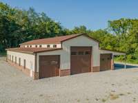 The secondary barn is 48x84 with a 24’ center bay, dual 12’ side sheds, ThermaGuard insulation, rock wainscot, plenty of windows, multiple garage doors, walk- through entries, an open lean- to with painted concrete floors, overhead lighting with water roughed in.