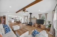 Idyllic Countryside Retreat on 14. 9 Acres built in 2023, this custom western cedar siding residence and detached garage with shed were crafted with exceptional attention to detail. Inside, faux wood tile flows throughout, offering both style and lasting durability. The 1, 490 sq. ft. open- concept floor plan provides an inviting space centered by a wood burning stove in the living room and styled by wood beamed ceiling. Two bedrooms, both secluded ensure comfort and privacy for the residents.