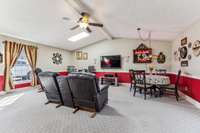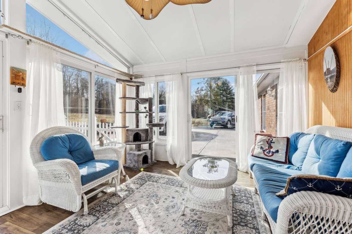 Inside, a heated & cooled sun porch surrounded by glass provides the ultimate spot for evening relaxation. The family room boasts a walk- up bar, while the cozy den offers a fireplace with gas logs—perfect for enjoying the big game or a card night. The spacious primary suite includes a walk- in tile shower, abundant closet space, and private access to the deck.