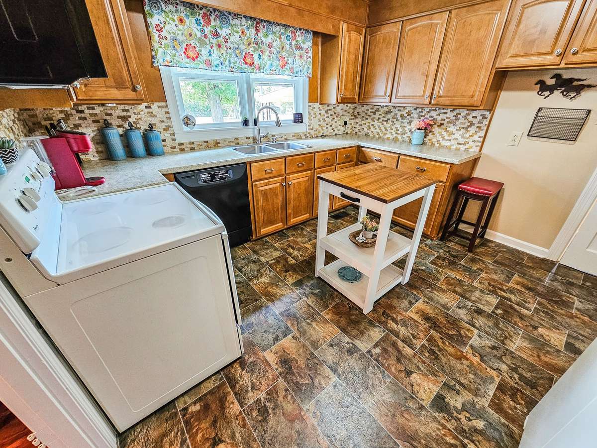 The kitchen had a total makeover a few years ago. Updates include lots of cabinetry, tile backsplash, and new flooring. The island and appliances, to include the washer and dryer, will remain with the house.