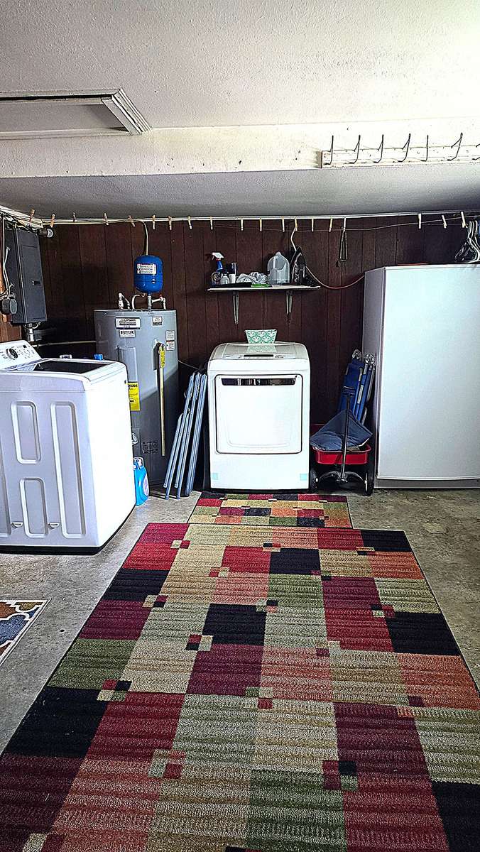 Spacious utility room with washer/dryer hookups. Some shelving will remain.