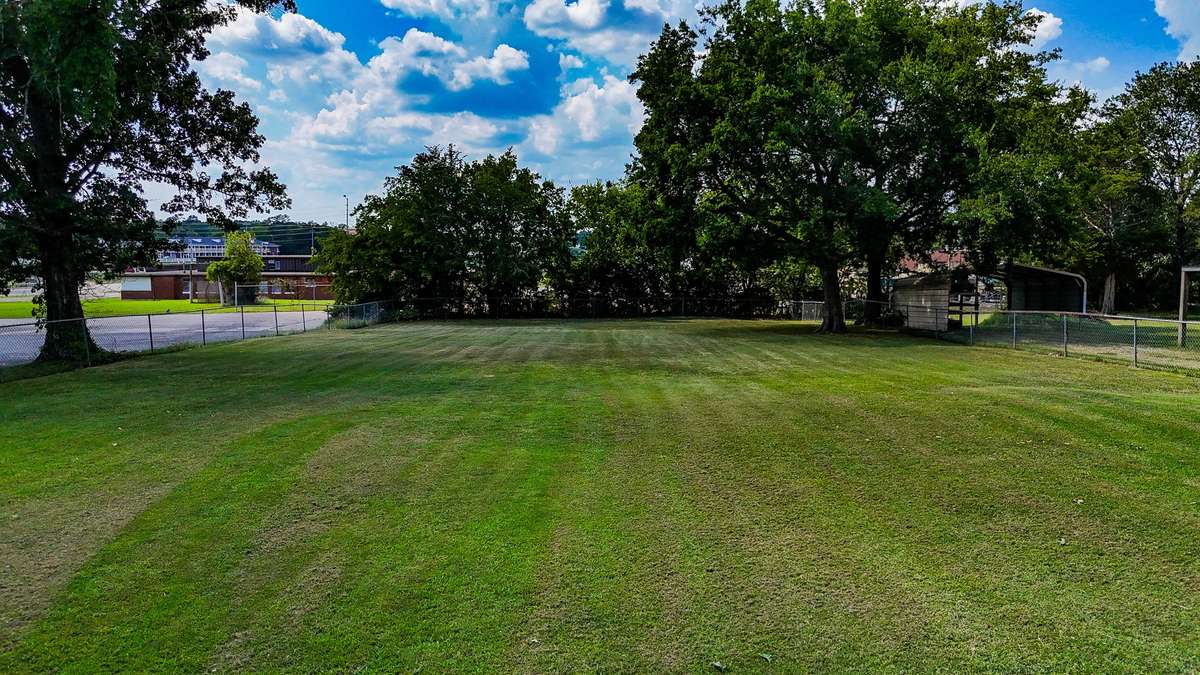 The large back yard with mature shade trees is completely fenced.