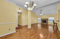This charming 3- bedroom, 2- bath home offers the perfect blend of comfort and style—all on one level. Step inside to an inviting open layout where hardwood floors, soaring vaulted ceilings, and a distinctive stacked stone fireplace set the tone for relaxed living. The kitchen is designed for both convenience and connection, seamlessly flowing into the eat- in area and formal dining room—ideal for everyday life and entertaining.