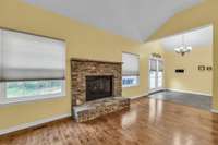 This charming 3- bedroom, 2- bath home offers the perfect blend of comfort and style—all on one level. Step inside to an inviting open layout where hardwood floors, soaring vaulted ceilings, and a distinctive stacked stone fireplace set the tone for relaxed living. The kitchen is designed for both convenience and connection, seamlessly flowing into the eat- in area and formal dining room—ideal for everyday life and entertaining.