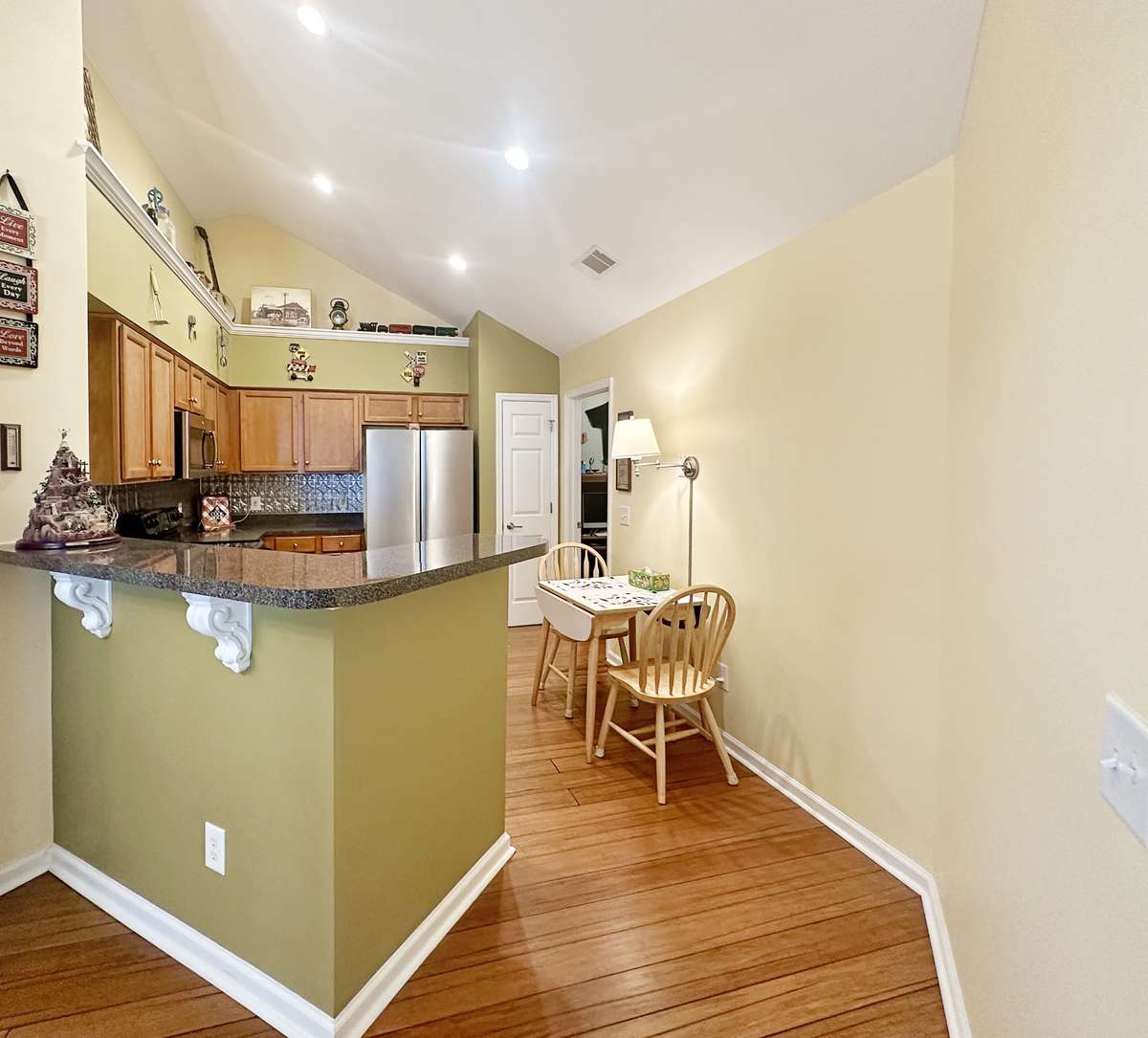 Open- concept living with cathedral ceilings and beautiful bamboo hardwood floors in the main living areas