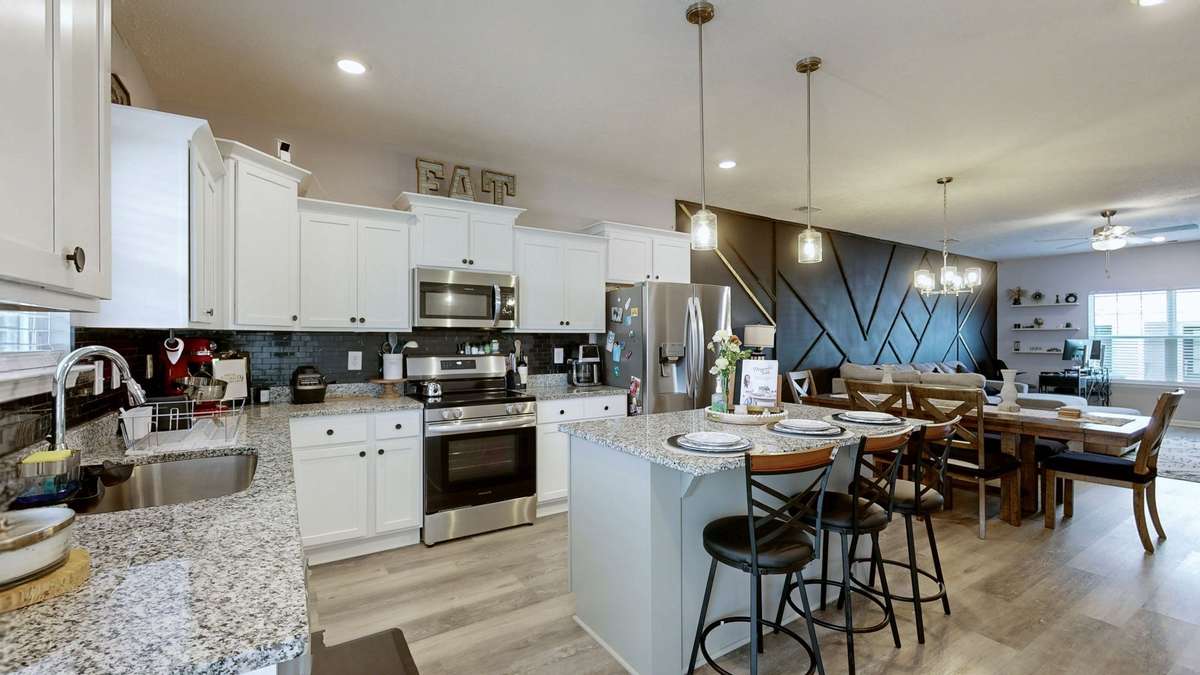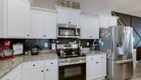 Updated kitchen with granite countertops, stainless steel appliances, center island, and modern backsplash