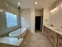 2nd full bath down w/tile above shower. Tile floors. Custom cabinet w/quartz tops