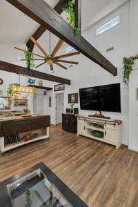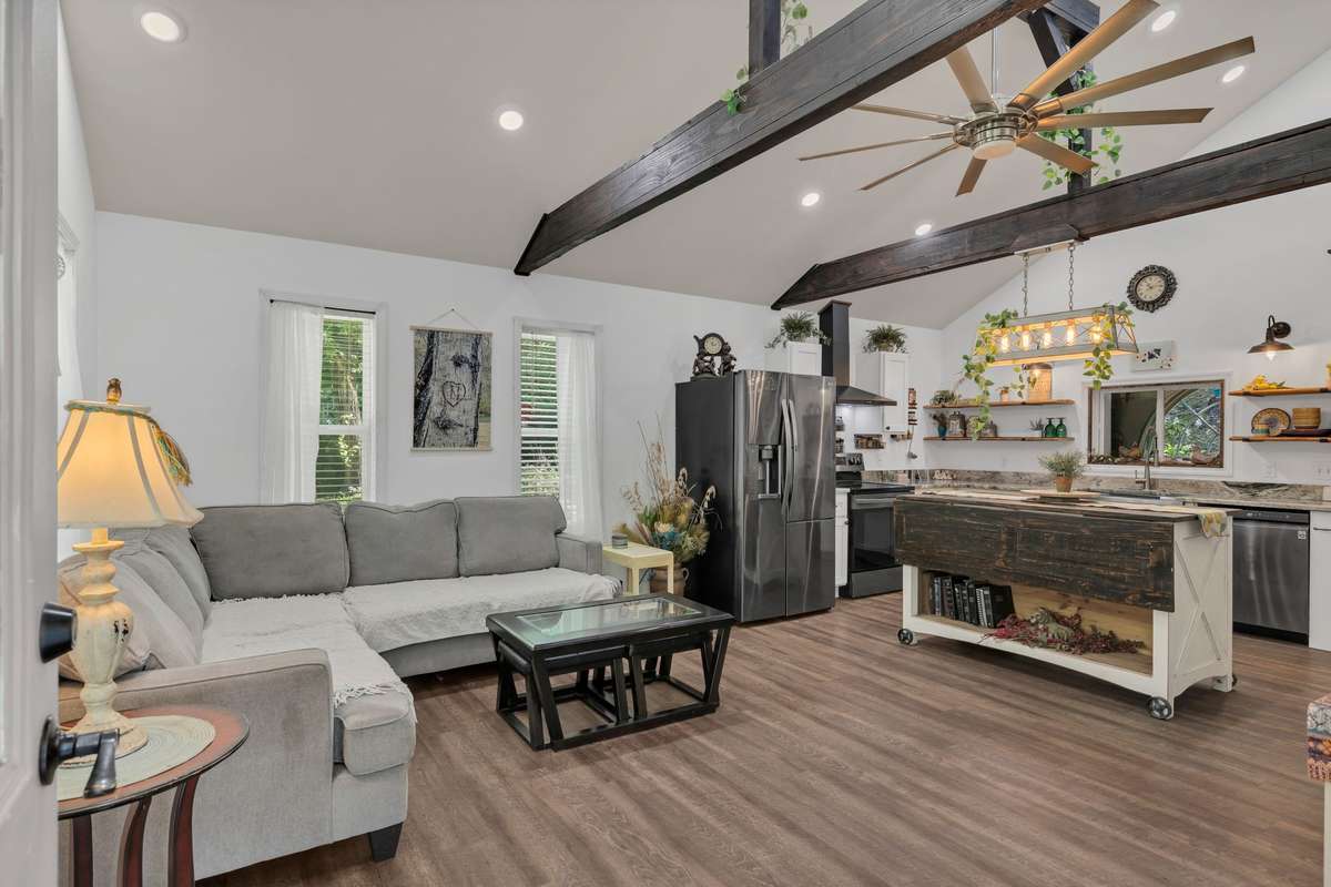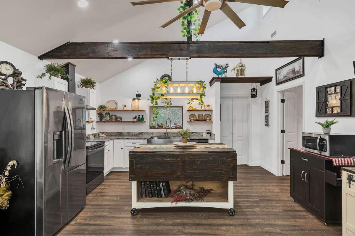 CREEK! SERENITY! 4. 56 COUNTRY ACRES! 24' x36' 220 wired shop building with sound studio! Take a look at this adorable custom built metal siding home sitting on lush, beautifully landscaped, sit back, relax overlooking your very own creek! This split roof style home features open floor plan, 2' x6' exterior walls, 12 ' Vaulted ceiling on west side with stained glass transit windows. Large rustic beams. LVP flooring. Large island with drop down leaf. Disk lights throughout. Beautiful Granite countertops, Stainless appliances all stay. Split Farmhouse stainless sink. Huge mudroom/ pantry. Large bedroom with Walkin closet. Large custom tiled wet room, claw foot tub, multi jet shower. High speed fiber internet! 14x23 patio. 12x21 She shed. Wired, plumbed, insulated. 8x20 shipping container, in great condition also available. Storm shelter. Additional shop building. 2 chicken coops. Fruit trees, grape vines. Amish Country but just off main highway.