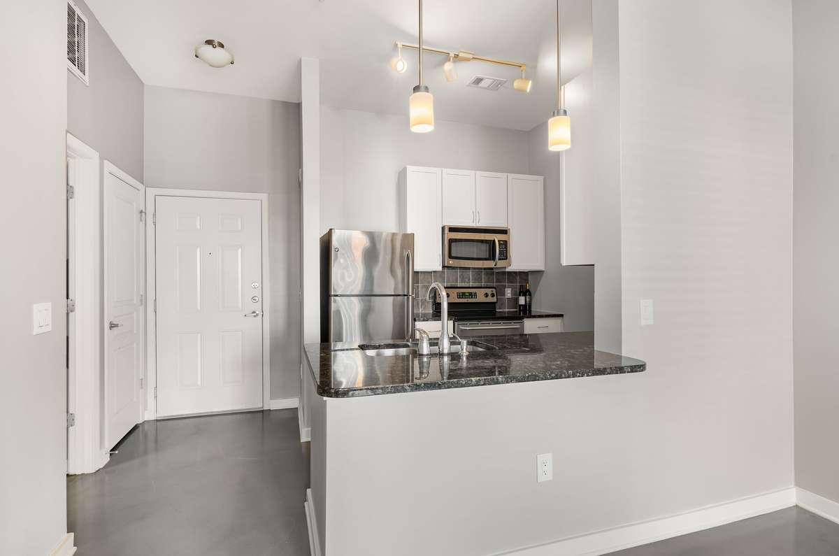 Move in Ready West End ground floor, poolside condo! This home features like new kitchen appliances, in unit Washer and Dryer, stained concrete floors and a spectacular saltwater pool view. Bristol West End amenities include: a refreshing pool with the sounds and view of the elaborate fire place and sparkling fountain. Grill out with friends or workout out in the fully equipped fitness center. Enjoy the owners lounge w/ free Wi- Fi or reserve the lounge featuring a full kitchen and pool table. Onsite management is there to assist with resident needs. No need to look for parking! This unit features an assigned parking space in the secured gated garage.