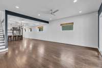 The open kitchen, dining and living rooms spill out to a large semi- covered back deck featuring an automated screen that allows covered/ screened outdoor living or full sun and open air as desired. Relax in your home with the outdoor fire pit ablaze and enjoy fresh air while the screened porch protects against unwanted pests. For full sun and outdoor enjoyment, head up to the rooftop where you' ll be greeted by large patio covered with artificial turf laid over a natural turf deck.