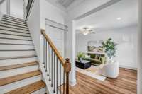 Step inside to discover exquisite finishes including soft- close cabinetry, a striking mosaic tile backsplash, and an upgraded trim package featuring five- panel interior doors. Soaring 9- ft ceilings on both levels create a bright, open feel.