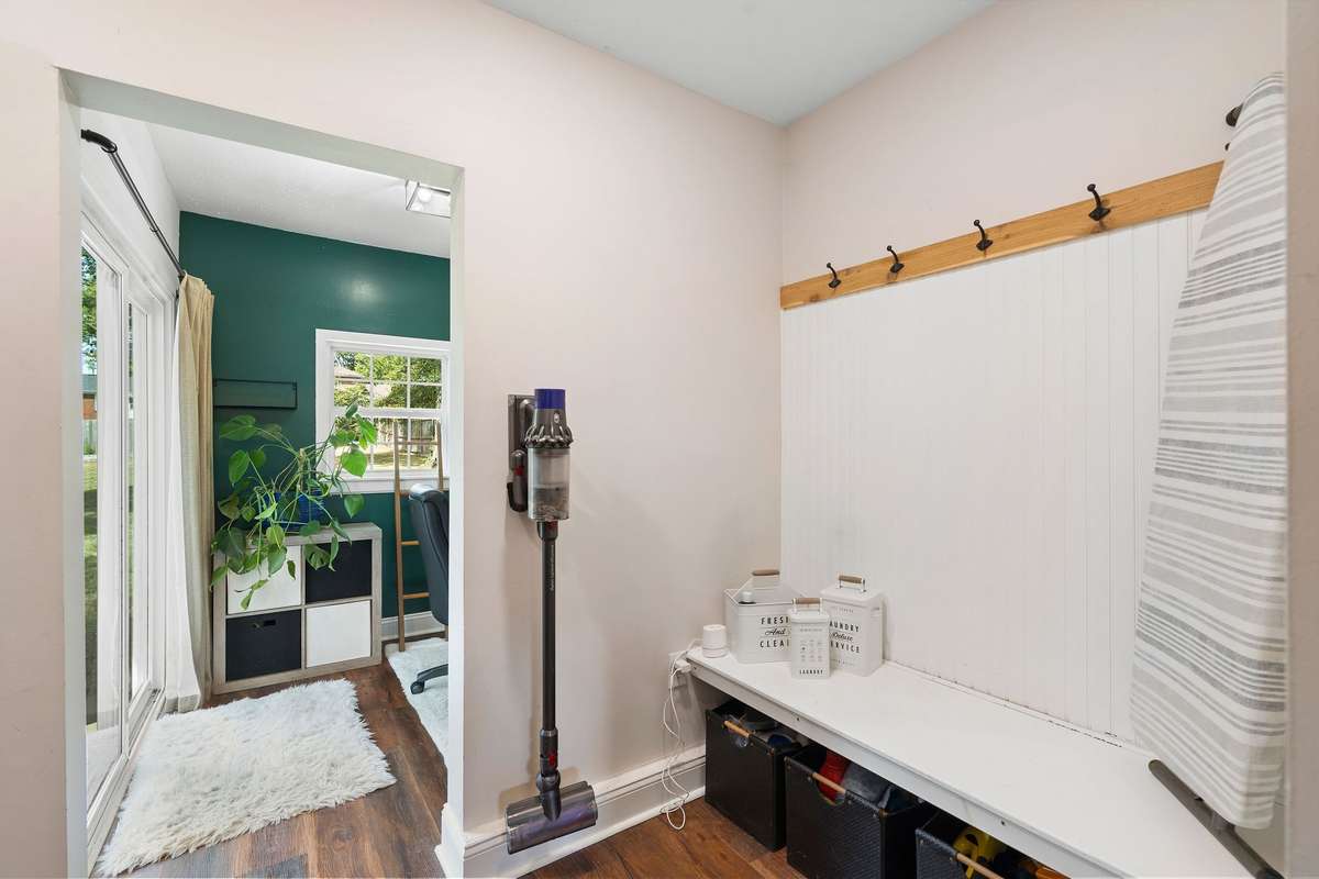 New kitchen faucet, garbage disposal, and washer/ dryer room with built- in storage.