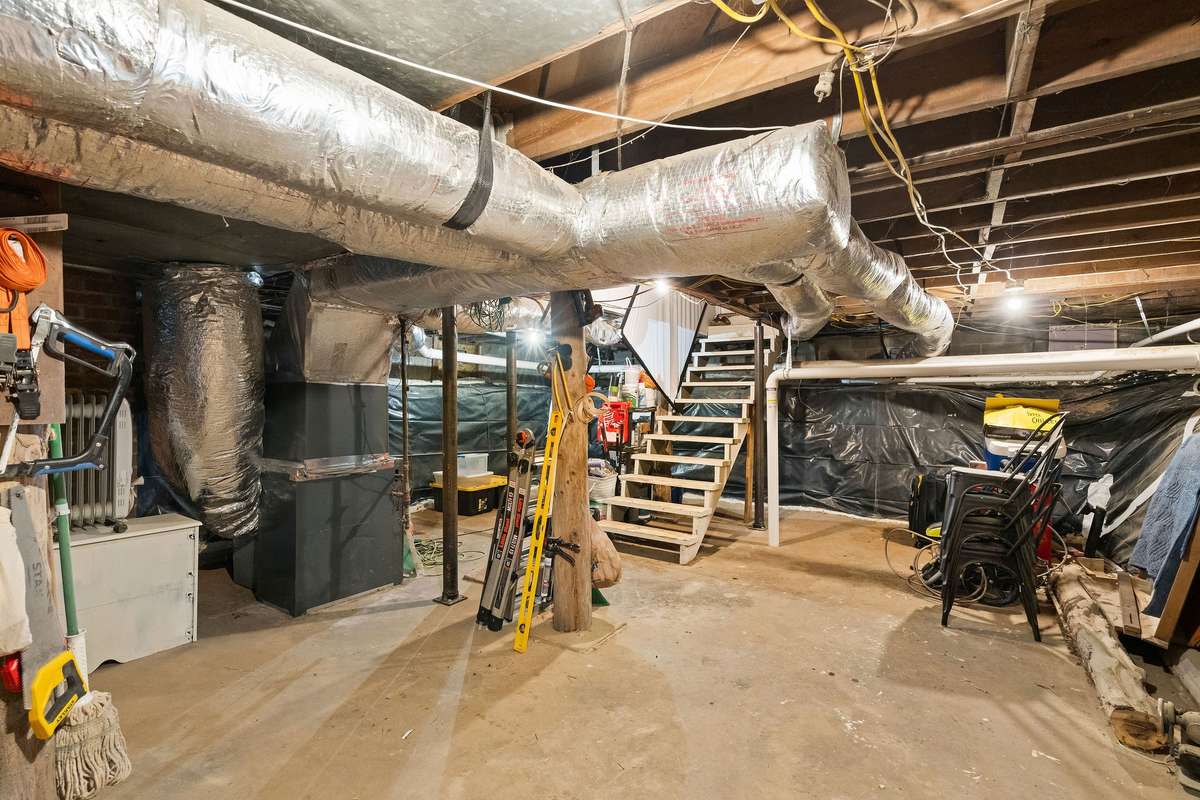 Brand- new radon mitigation system and steel foundational beams in the basement.