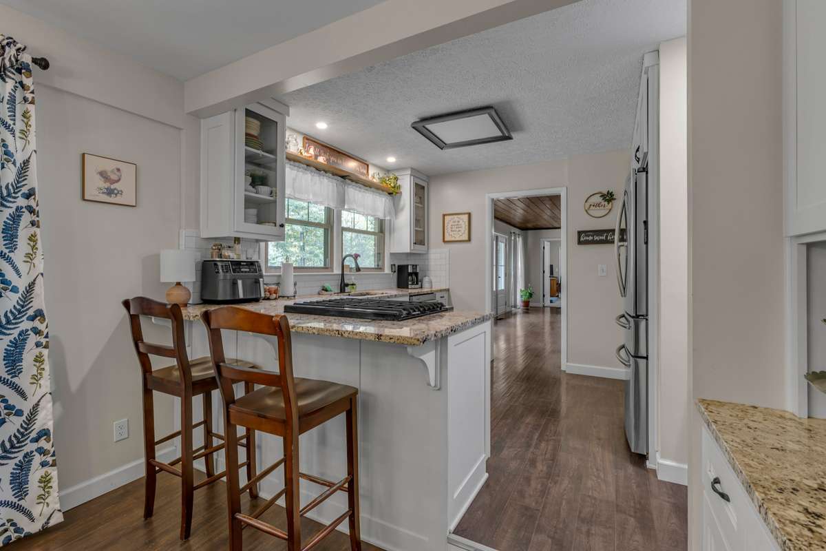 Beautifully maintained brick home with full basement, nestled on 3 acres of lush trees. Conveniently located just minutes from schools. Recent updates include windows and a roof that are approximately 3 years old. Gorgeous renovated kitchen with granite countertops. Refrigerator, oven, gas stove and dishwasher remain. Gas fireplace and beautiful wood ceiling in living room. Master bedroom features an exterior door to covered deck & his and her closets ( her closet is a large walk- in closet) . Laundry room on main level with cabinets, closet and storage shelves. 11x11 room by carport entrance is great for a sun room or mud room. Bedroom in basement has a fireplace and full bath with laundry connections. Heated and cooled garage and workshop area in basement. Conveniently designed with two driveways—one leading to the main level and one to the basement. Large attached carport/ covered patio on main level. Covered front porch. Gutter guards. Chicken coop. High speed internet. City trash pickup.