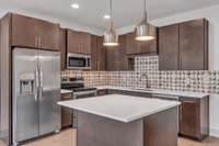 Kitchen area offers informal dining at island, tile backspace, SS appliances, and space for a separate dining table.  Access to a main floor bedroom shown behind kitchen.  **This Photo is virtual staged**