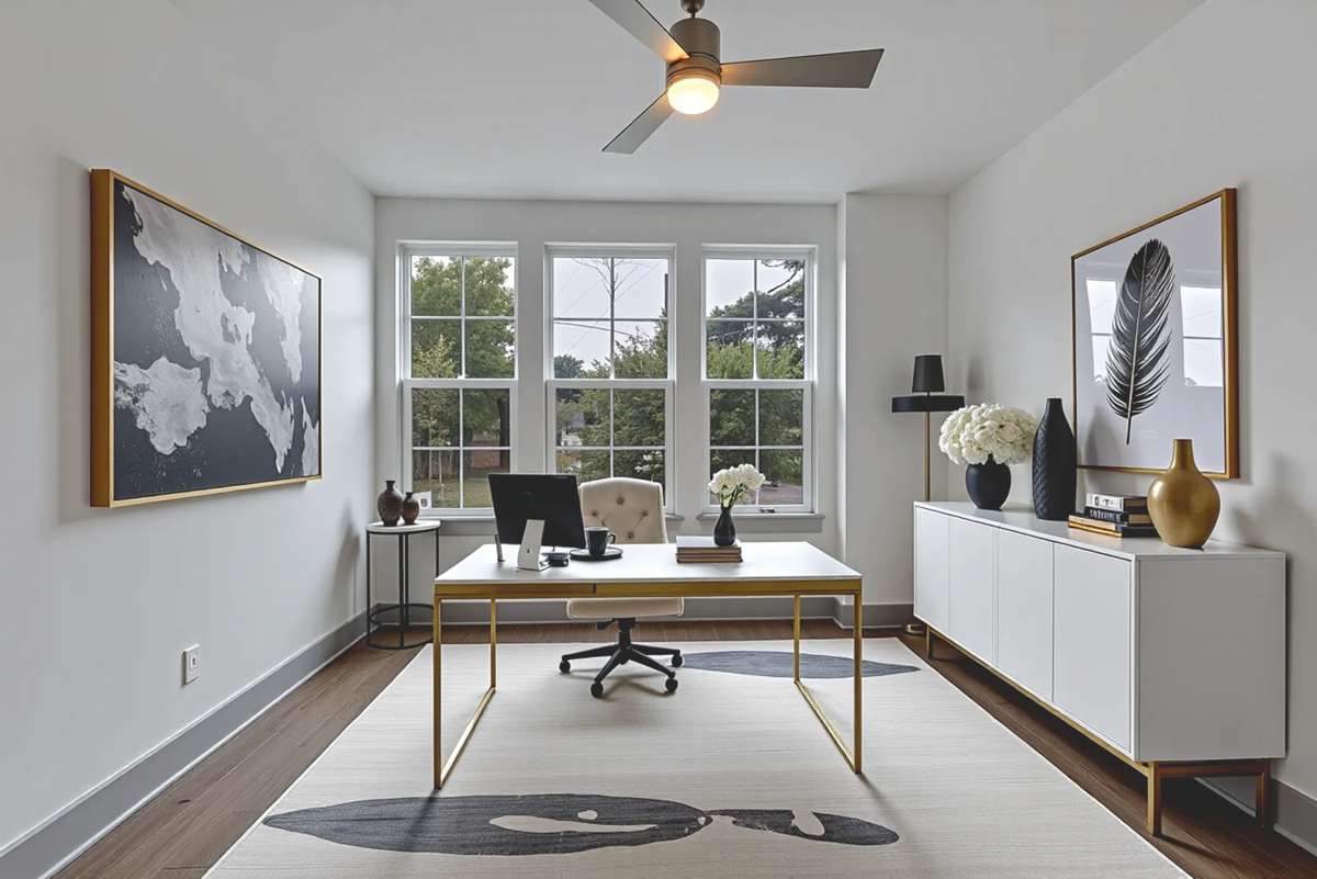 One of the additional secondary bedrooms shown here staged as an office.  Hardwood flooring, neutral color scheme, and large windows.  **This photo is Virtually Staged**